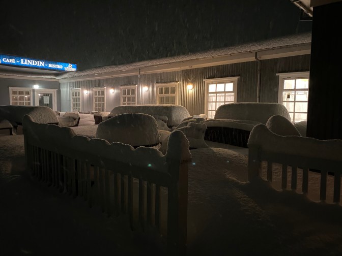 Zuletzt ein Highlight…. Als wir vom Gletscher wieder nach Reykjavik wollten (ca. 2Std. Fahrt), fing es dermaßen an zu schneien, dass wir umkehren mussten und in einer Jugendherberge eingekehrt sind. Auf dem Bild sieht man den Schneefall von nicht einmal 3 Stunden! Das Highlight war aber das Restaurant Lindin, das es in dem Kaff gab.Das war nämlich saugemütlich und megalecker! Gemeinsam mit einem Pärchen, was wir in der Jugendherberge kennengelernt hatten, verbrachte wir einen wunderbaren Abend mit abschließender ausartenden Schneeballschlacht!